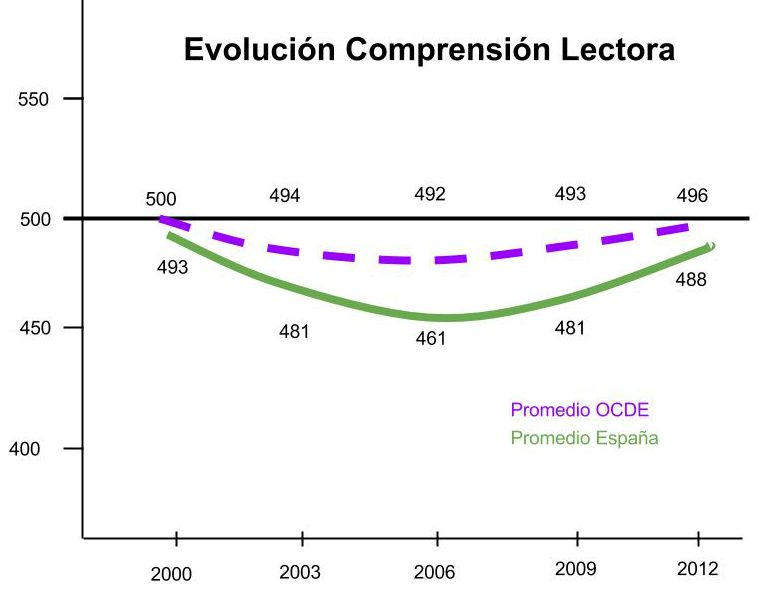 En comprensión lectora se ha conseguido 488 puntos sobre 496, situando a los alumnos españoles ocho puntos por debajo de la media de la OCDE. Si comparamos estos datos con los resultados del 2000, año en el que se consiguió más nota con 493 puntos, se puede ver que la diferencia no ha sido abismal, ya que sólo son cinco puntos más que en 2012.