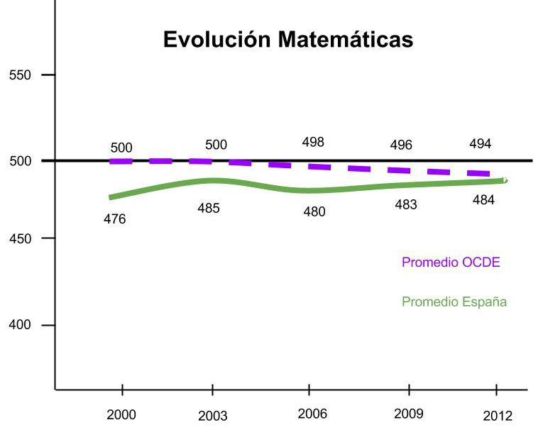 Los estudiantes españoles han conseguido en matemáticas 484 puntos, diez puntos por debajo de la media de la OCDE que se establece en 494 puntos; pero sólo un punto inferior a lo conseguido en 2003, año en el que se consiguió la mejor puntuación en esta materia, con 485 puntos.