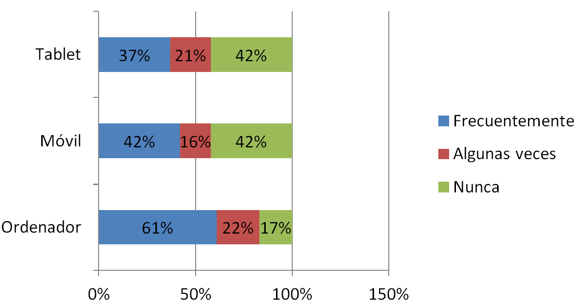 Aunque el ordenador sigue siendo la herramienta favorita (un 83% de los estudiantes afirma utilizarlo habitualmente), el móvil (con un 57%) y la tablet (58%) se posicionan como herramientas habituales en el estudio, aunque ambos dispositivos conviven con el ordenador en un 70% de los casos.