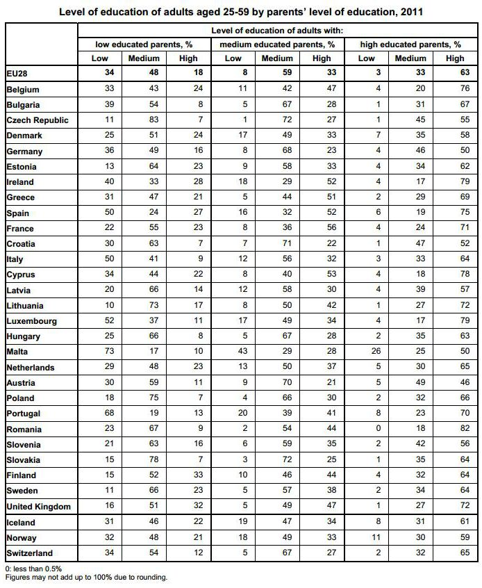 El estudio del Eurostat concluye que el 50% de los hijos con padres con una baja formación hereda la misma clase social que sus progenitores. Es decir, que los jóvenes de estas familias no apuestan por seguir formándose, afianzándose así en la misma clase social que sus padres.