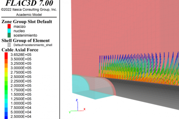 FLAC3D es un software de cálculo numérico tridimensional en diferencias finitas desarrollado por Itasca Consulting Group. Es uno de los programas de análisis numérico más completos, reconocidos y de uso más extendido a nivel mundial en los campos de la ingeniería geotécnica y la minería. El software permite analizar problemas estáticos y dinámicos no linéales en pequeñas o grandes deformaciones con prácticamente cualquier geometría, ya sea en suelo o en roca y teniendo en cuenta o no el acoplamiento hidromecánico. Incorpora una gran variedad de modelos constitutivos elásticos, plásticos y elasto-viscoplásticos, así como elementos estructurales lineales y superficiales especialmente concebidos para modelizar vigas, pilotes, anclajes, cables, bulones y placas. Así mismo, permite considerar planos de deslizamiento y la interacción suelo-estructura por medio de elementos de tipo “interfase”. El módulo principal del software puede complementarse con tres módulos opcionales (dinámico, fluencia (creep) y térmico).
