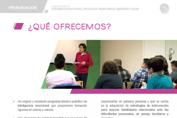 Un programa transversal adaptado a alumnos con un interés por los enfoques multidisciplinares, que ofrece la opción extra de incluir en la formación contenidos específicos de Coaching como una herramienta, siempre en la línea del Máster. Un aprendizaje vivo, emocional y dinámico con un carácter integrador y cercano, tanto en formato semipresencial como online. Un formato de prácticas que el alumno pueda experimentar en primera persona y que se centra en la adquisición de estrategias de intervención para mejorar habilidades relacionales ante las dificultades personales, de pareja, familiares y grupales. Una experiencia que contribuirá a que el alumno conozca y comprenda los beneficios personales de la mejora de la Inteligencia Emocional en la toma de decisiones, el aprendizaje, el rendimiento académico y profesional, y la salud. Una formación que ayudará a potenciar el rol del entrenador en Inteligencia Emocional tanto a nivel personal como profesional, con prácticas y supervisiones desde el primer encuentro. Una formación que dotará al alumno de competencias teóricas y prácticas en Inteligencia Emocional. En ámbitos como el autoconocimiento y la autoestima, las emociones, las actitudes, la personalidad y la calidad relacional y sus bases psicobiológicas.