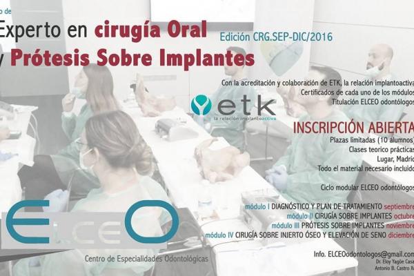 El Título de Experto en cirugía oral, implantología y prótesis sobre implantes que imparte el centro ELCEO en Madrid, te preparará durante 4 meses para realizar el diagnóstico y el plan de tratamiento de tus pacientes. También te formarás en cirugía de implantes y tendrás la oportunidad de practicar en cuerpos reales para poner a prueba tus conocimientos. Además, conocerás las prótesis sobre implantes y aprenderás sobre injertos y elevación de seno.
